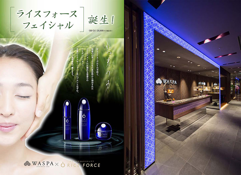 このたびWASPAは、国産の白米100%の原材料から抽出されたエキスをもとに作られた「ライスフォース化粧品」を、優れた「和」の商材としてセレクトし、「ライスフォースフェイシャル」としてコラボレーションをスタートしました。「お米」と「発酵」によって作られるライスフォースのこだわり抜いた高い保湿力をWASPAの技術に取り入れ、お肌にしっかり浸透させていきます。